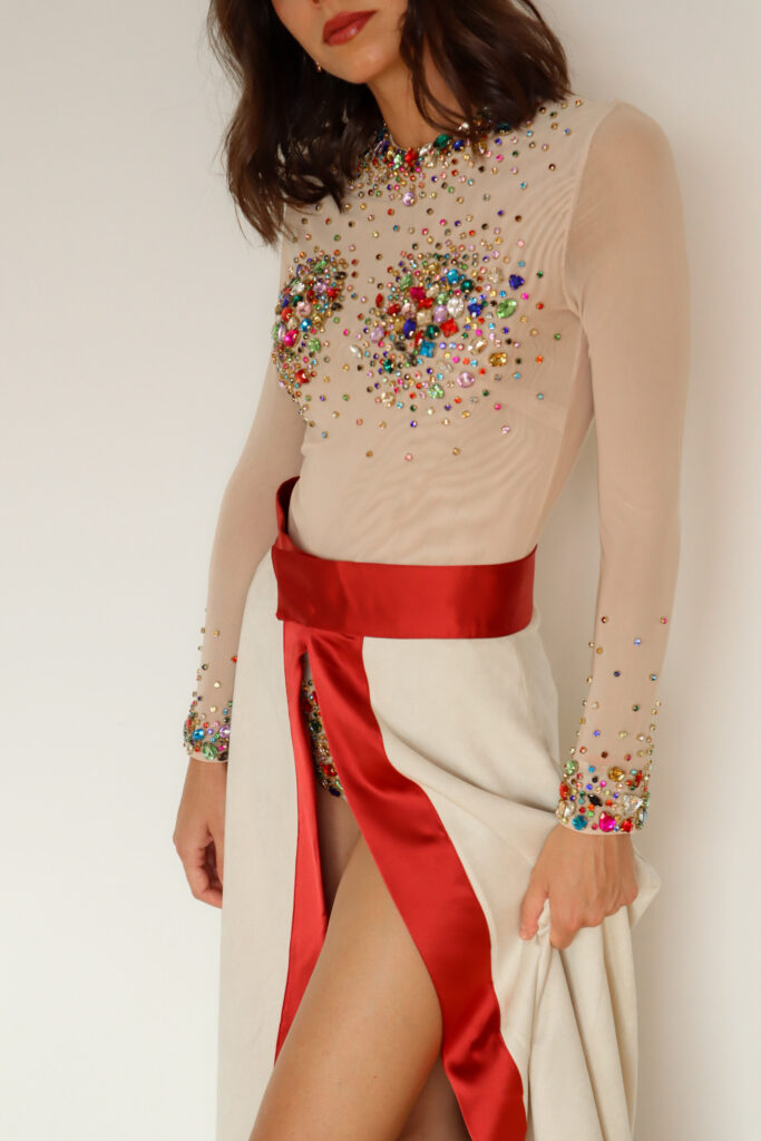 La sobrefalda se inspira en el tapiz característico donde se practica la gimnasia rítmica, algo que se refleja tanto en la tapicería de microfibra como en los bordes rojos que la delimitan. El body, por su parte, toma como referencia los maillots de competición, utilizando el mismo tipo de tejido y brillos que envuelven y realzan la figura.