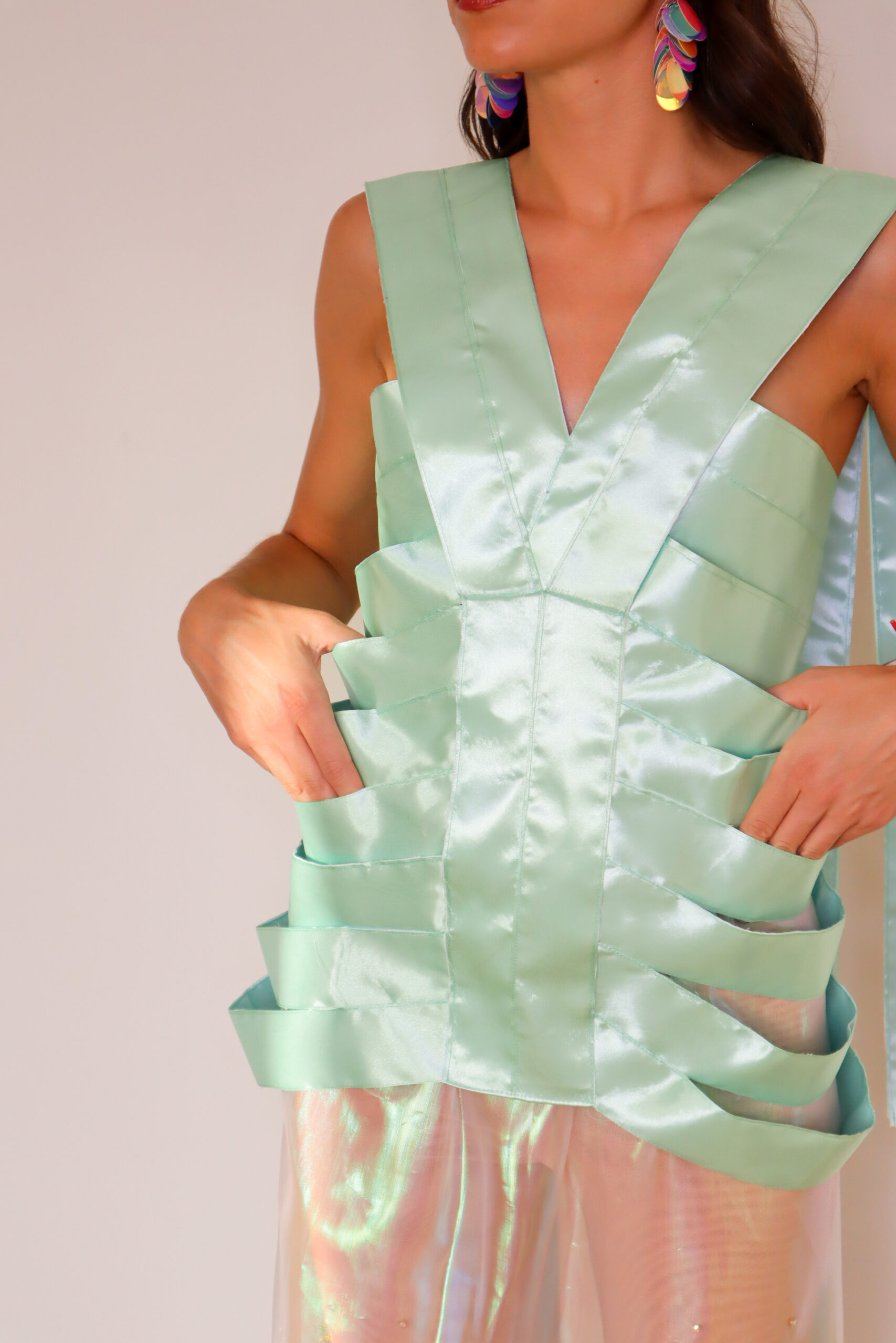 El vestido está elaborado a partir de cintas utilizadas para este deporte , generando un efecto visual de cascada haciendo referencia al movimiento de estas. La falda, de tejido transparente con acabado holográfico, refuerza la referencia estética a la gimnasia, aportando ligereza y dinamismo. Por último, los leggins, confeccionados en malla, incorporan aplicaciones de pedrería que recuerdan a las mallas de competición, difuminándose delicadamente desde el bajo hacia arriba.