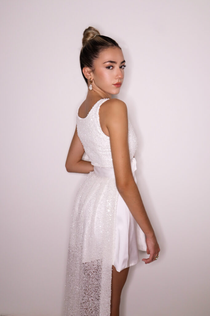 Este vestido fue confeccionado completamente a medida para la preboda de María. Cada detalle fue diseñado especialmente para ella, reflejando su estilo personal y resaltando su esencia. Desde la elección de los tejidos hasta los acabados finales, todo el proceso se realizó pensando en crear una pieza que llevase su esencia.